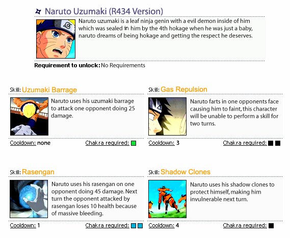 B) Although thats like using the "in the anime" line... "IRL all Jin Mei members are a thousand times more hardcore than anyone else" B) but we still ought to be overpoward. I prefer chars that dont have real moves sometimes. Like..."Itachi3334 does 3334 damage to one enemy" |
