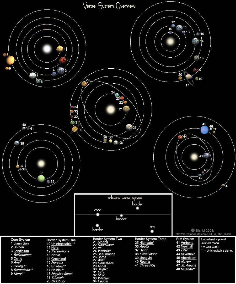 This is the verse map made specifically for this RPG, Out In The Black. You can click on the image to view the full version of the map. This is not meant to be on scale, this is purely a reference where planets are located, and to get a 'feel' of the verse.