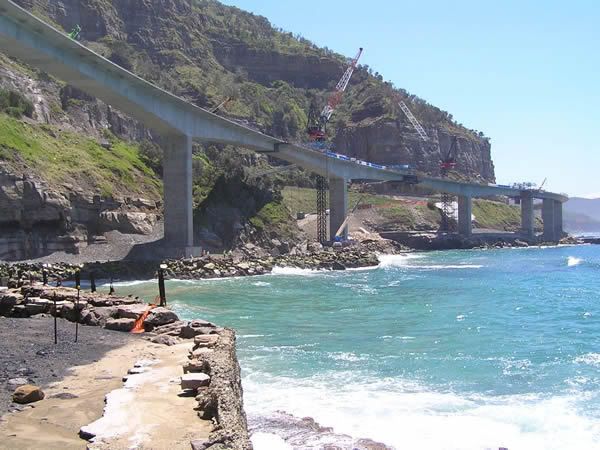 The Sea Cliff Bridge on the southern borders of the Shire is an engineering showcase and deserves a little post of its own. Opened on December 11, 2005 the bridge took about 15 months to construct at a total cost of AU$52M. Posted Image The new Sea Cliff Bridge has two 3.3 metre-wide lanes with 1.2 metre-wide shoulders. A separate footpath has been built next to the traffic lanes on the eastern (seaward) side. The two-lane bridge spans the southern amphitheatre and the middle headland. Sea Cliff Bridge is made up of two sections using different construction techniques. A balanced cantilever section (similar to the Mooney Mooney and Pheasants Nest bridges) extends from the existing road at the southern headland and curves to join an incrementally launched section (similar to the Woronora Bridge). This joins the existing road at the middle headland. The bridge, to the east of the existing road, provides a long-term solution for all road users. The project also includes various geotechnical and stabilisation works along the cliff line. The balanced cantilever section: Using the cantilevering method, the superstructure of bridge is built from the piers by means of cantilevered formwork. The structure advances (symmetrically) from a short stub on top of each pier in segments of about 3 m to 5 m length to the mid span or to an abutment. Using this technique allowed building out over the sea without the need for supporting formwork. Bridge features include: Curved, 455 metre long balanced cantilever bridge along the coastline. Built up to 45 metres to the east of the existing road to bypass the unstable cliff line and rock falls. Road level 41 metres above the sea level at its highest point. Four piers and five spans – first and last 70 metres long with central spans 105 metres long. Posted Image The incrementally launched section: The incremental launching method consists of casting 15 metre to 30 metre long sections of the bridge deck at the northern bridge abutment. The completed section was then pushed out across the piers and the next section was then cast onto it. The bridge deck slowly advanced south with the first section having been pushed the full length of the bridge. Features of bridge include: Multiple span curved 210 metre long bridge bypassing the middle headland to join the balanced cantilever bridge. Built 25 metres east of the existing road. Seven piers and seven spans, the first 24 metres and the others 31 metres long Posted Image Posted Image