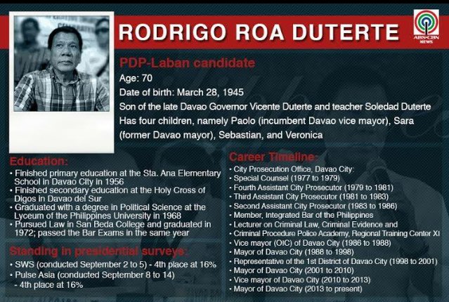 I saw Duterte's interview done by a panel from ABS-CBN. Very funny guy even when he's not trying to be funny. It's hard not to see this man as the man of the people. The 2nd coming of Pres Magsaysay maybe? Many voters are identifying themselves with him. A number of Facebook users opposed to Duterte's candidacy have been receiving death threats from Duterte supporters. Of course *not all* Duterte supporters are as extreme, but the man inspires the worst in his fanatics -- just a glimpse of what we may be in for if he wins. Posted Image Someone posted this about Duterte in a Comment section: