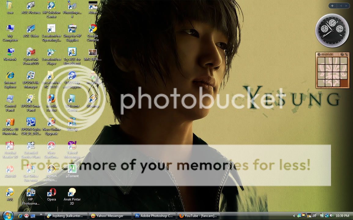 Wallpaper laptop bokap yang sekarang nih xDD![]() Klik skrinsyut untuk ukuran besar xD ARGH INI POSENYA YESUNG GAK NAHAN BANGET SUMPAHAN KYAAAAAAAAA~ *dicaplok* Kalo laptop saya sendiri sih sekarang wallpapernya.. dari sini nih, cuma lagi sekarat abisnya setiap dinyalain pasti error lagi error lagi. =w= Y!M cuma lagi chat sama Jopih tentang ini nih—A MUST WATCH bagi para ELF xD Trus Potosop itu lagi bikin siggy buat di SoTW sama editan satu foto hihihi.. Mozilla lagi bertab-tab itu. Ryoku, Mr. Blue Sky, Photobucket, Plurk, dua window Youtube, sama Deviantart xD |