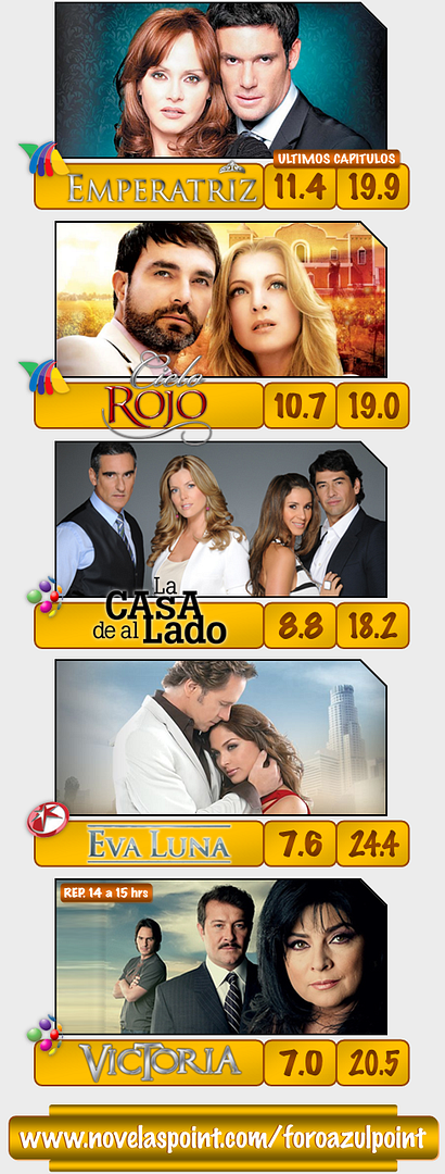 RATING MÉXICO NACIONAL >>>>>>>>>>>>>>>>>>>>>>>>>>>>>>>>>>>>>>>>>>>>>>>>>>>>>>>>>>>>>> Posted Image Posted Image Posted Image PICOS 1. UNA FAMILIA CON SUERTE Posted Image 21.4 / 23.2 / 23.1 / 23.3 2. DOS HOGARES Posted Image 21.4 / 22.0 / 23.1 / 22.3 3. LA QUE NO PODÍA AMAR Posted Image 17.0 / 18.4 / 19.2 / 21.4 / 22.2 4. AMORCITO CORAZÓN Posted Image 15.2 / 14.6 / 15.0 / 16.5 5. ESPERANZA DEL CORAZÓN Posted Image 12.4 / 12.5 / 12.9 / 14.1 6. EMPERATRIZ Posted Image 12.2 / 10.9 / 11.2 / 11.6 / 12.0 7. CIELO ROJO Posted Image 10.3 / 10.9 / 10.7 / 10.6 8. LA CASA DE AL LADO Posted Image 6.8 / 8.8 / 10.3 / 9.9 9. EVA LUNA Posted Image 7.3 / 7.8 / 7.5 / 7.9 / 7.5 / 7.4 10. VICTORIA (R - 14 a 15 hrs.) Posted Image 5.7 / 6.5 / 7.4 / 8.4 >>>>>>>>>>>>>>>>>>>>>>>>>>>>>>>>>>>>>>>>>>>>>>>>>>>>>>>>>>>>>> Posted Image PICOS HUÉRFANAS Posted Image 6.6 / 6.3 / 6.6 / 7.6 LA VERDAD OCULTA (R) Posted Image 6.5 / 6.1 / 5.6 / 5.5 VICTORIA (R - 14 a 15 hrs.) Posted Image 3.7 / 4.5 / 5.3 / 5.5 >>>>>>>>>>>>>>>>>>>>>>>>>>>>>>>>>>>>>>>>>>>>>>>>>>>>>>>>>>>>>> Posted Image Primero noticias … 6.1/30.4 Hoy … 7.8/29.9 La Rosa de Guadalupe … 7.0/25.9 Noticiero Lolita Ayala … 7.1/20.0 Laura … 12.4/32.7 La Rosa de Guadalupe … 16.0/39.7 Noticiero Joaquín López-Dóriga … 13.2/26.8 Noticiero TD … 6.9/18.5 Posted Image Hechos am … 4.2/24.4 JUEGOS PANAMERICANOS GUADALAJARA 2011 PanAMericanos … 4.9/19.0 Venga la alegría … 6.2/24.0 La vida es una canción … 6.2/22.7 Lo que callamos las mujeres … 5.6/18.4 Hechos meridiano … 6.4/18.7 Ventaneando … 4.8/12.6 Generación 2011 … 4.5/11.8 Lo que callamos las mujeres … 5.8/14.5 Cosas de la vida … 11.3/22.6 Hechos … 8.8/18.3 Campañeando … 5.0/13.3 JUEGOS PANAMERICANOS GUADALAJARA 2011 Protagonistas Panamericanos … 7.3/13.0 Posted Image JUEGOS PANAMERICANOS GUADALAJARA 2011 Acción Panamericana … 2.4/9.2 Película: La estrella vacia … 1.7/6.5 JUEGOS PANAMERICANOS GUADALAJARA 2011 Competencias … 4.3/11.1 La jugada Panamericana … 4.3/10.7 Competencias … 4.5/9.8 Las noticias por Adela … 3.4/6.3 JUEGOS PANAMERICANOS GUADALAJARA 2011 Competencias … 5.1/8.9 Decisiones extremas … 9.6/29.6 Posted Image Galactik football … 1.1/10.2 Dora la exploradora … 1.8/11.7 Plaza Sésamo … 3.0/14.3 Transformers … 3.4/14.9 La pantera rosa … 4.7/14.9 El clan de Yogi … 5.4/20.5 El Chavo animado … 7.4/27.6 Los pitufos … 6.6/26.9 Dragon Ball Z … 7.2/27.2 Los padrinos mágicos … 7.5/25.9 Mighty B: La súper abeja … 8.1/25.0 El Chavo animado … 8.7/23.7 Power Rangers Samurai … 7.5/19.7 Bob Esponja … 8.7/22.4 Drake y Josh … 7.7/19.6 I Carly … 7.9/19.2 I Carly … 9.7/24.0 Malcolm el de en medio … 7.9/17.4 JUEGOS PANAMERICANOS GUADALAJARA 2011 Futbol: México vs. Trinidad y Tobago … 8.4/15.2 Miembros al aire … 6.9/12.8 Está cañón … 5.6/14.9 Posted Image A quien corresponda … 1.5/5.3 Película: El presidente y su consejero … 2.8/8.1 JUEGOS PANAMERICANOS GUADALAJARA 2011 Competencias … 5.6/14.3 Competencias … 4.2/10.3 Línea mortal … 5.2/11.3 JUEGOS PANAMERICANOS GUADALAJARA 2011 Futbol: México vs. Trinidad y Tobago … 7.9/14.2 Campeón Azteca … 7.0/12.4 Difícil de creer … 8.3/15.6 WWE Smackdown … 8.0/25.6 ***************************************************** http://www.novelaspoint.com/foroazulpoint ***************************************************** |